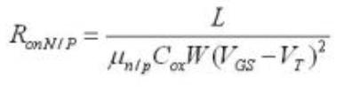 低導(dǎo)通電阻是模擬開(kāi)關(guān)在音頻切換用途時(shí)的主要選擇因素。值得注意的是,導(dǎo)通電阻是針對(duì)具體的VCC 、VIN(電壓輸入)及給定負(fù)載電流而定義的。在晶體管級(jí),RON為起始長(zhǎng)度(L)、寬度(W)、電子與空穴遷移率、氧化層電容、門(mén)限電壓及信號(hào)電壓的函數(shù)。如下所示: