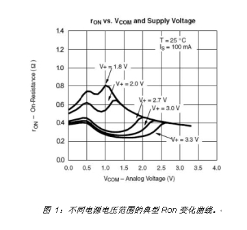 RON會(huì)隨著電源電壓的增加而減小。圖1顯示了上海英聯(lián)電子科技有限公司(下文簡(jiǎn)稱(chēng)英聯(lián)電子)的UM4684在不同電源電壓上測(cè)得的RON。導(dǎo)通電阻平坦度(RFLAT)即表示RON隨著VIN在0V至VCC或V-至V+)間變化而變化的情況,它是引起THD的主要原因。
