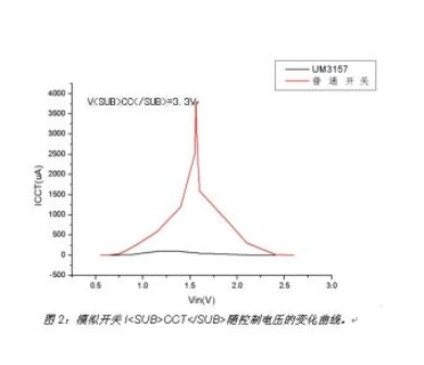 對(duì)于某些開(kāi)關(guān),電流消耗甚至高達(dá)幾毫安,對(duì)功耗敏感的便攜式設(shè)備而言,這樣的功耗是無(wú)法接受的。大多數(shù)標(biāo)準(zhǔn)模擬開(kāi)關(guān)的產(chǎn)品說(shuō)明書(shū)只給出了典型情況下(即開(kāi)關(guān)輸入控制信號(hào)的高電平與開(kāi)關(guān)供電電壓一致)的功耗指標(biāo),這容易讓設(shè)計(jì)工程師感到混淆,他們會(huì)驚奇地發(fā)現(xiàn)在低壓ASIC設(shè)計(jì)中的模擬開(kāi)關(guān)竟有幾毫安的漏電流。英聯(lián)電子的模擬開(kāi)關(guān)改善了控制電路的輸入緩沖器,只要芯片的控制輸入電壓大于VIH或小于VIL內(nèi),而不是等于0V或VCC,也能保持非常小的功耗。從圖2可看到采用該技術(shù)的英聯(lián)電子UM3157模擬開(kāi)關(guān)與普通的同系列模擬開(kāi)關(guān)在ICCT上的顯著區(qū)別。 [page]