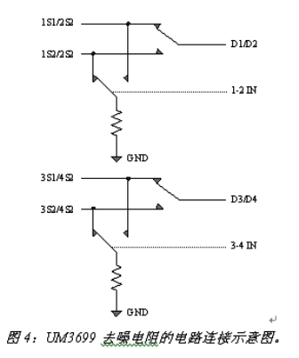 在音頻電路中,當(dāng)模擬開(kāi)關(guān)斷開(kāi)時(shí),由于寄生電容和電容失配,電容上的電荷無(wú)法釋放,從而導(dǎo)致耳機(jī)上的噪聲??梢酝ㄟ^(guò)在開(kāi)關(guān)斷開(kāi)時(shí)接通一個(gè)去噪電阻,來(lái)快速釋放電荷,從而提高音頻切換質(zhì)量。圖4是英聯(lián)電子的UM3699在開(kāi)關(guān)切換時(shí)去噪電阻的連接示意圖。