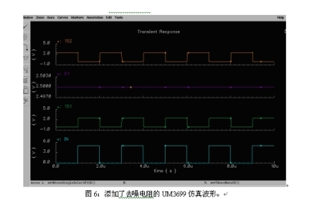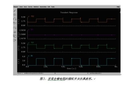 圖5是沒(méi)有采用去噪聲電阻時(shí)模擬開(kāi)關(guān)的仿真波形圖。D1為輸入的數(shù)據(jù)信號(hào)。IN為選擇端信號(hào)。當(dāng)IN為高電平時(shí),開(kāi)關(guān)通向1S1;當(dāng)IN為低電平時(shí),開(kāi)關(guān)通向1S2。當(dāng)開(kāi)關(guān)斷開(kāi)時(shí),由于寄生電容和選擇端切換脈沖的存在,開(kāi)關(guān)到地之間是高阻態(tài),所以寄生電容的電荷沒(méi)有放電回路。這樣,開(kāi)關(guān)的關(guān)斷端在較長(zhǎng)的時(shí)間內(nèi)將出現(xiàn)一個(gè)比輸入數(shù)據(jù)信號(hào)更高的電平,從而導(dǎo)致噪聲。圖6是采用圖4中的去噪電阻后開(kāi)關(guān)切換的仿真波形圖。由于開(kāi)關(guān)斷開(kāi)后連接了去噪電阻上,形成一個(gè)對(duì)地的放電回路,所以寄生電容上的電荷得以很快釋放,從而消除了開(kāi)關(guān)切換時(shí)的干擾電平,提高了開(kāi)關(guān)在音頻切換應(yīng)用時(shí)的聲音質(zhì)量。
