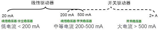市場(chǎng)上典型的LED驅(qū)動(dòng)器包括兩類,即線性驅(qū)動(dòng)器和開關(guān)驅(qū)動(dòng)器;大概的適用范圍見圖1。如電流大于500mA的大電流應(yīng)用采用開關(guān)穩(wěn)壓器,因?yàn)榫€性驅(qū)動(dòng)器限于自身結(jié)構(gòu)原因,無法提供這樣大的電流;而在電流低于200mA的低電流應(yīng)用中,通常采用線性穩(wěn)壓器或分離穩(wěn)壓器;而在200至500mA的中等電流應(yīng)用中,既可以采用線性穩(wěn)壓器,也可以采用開關(guān)穩(wěn)壓器。