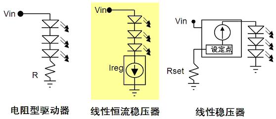 開關(guān)穩(wěn)壓器的能效高,且提供極佳的亮度控制。線性穩(wěn)壓器結(jié)構(gòu)比較簡(jiǎn)單,易于設(shè)計(jì),提供穩(wěn)流及過流保護(hù),且沒有電磁兼容性(EMC)問題。