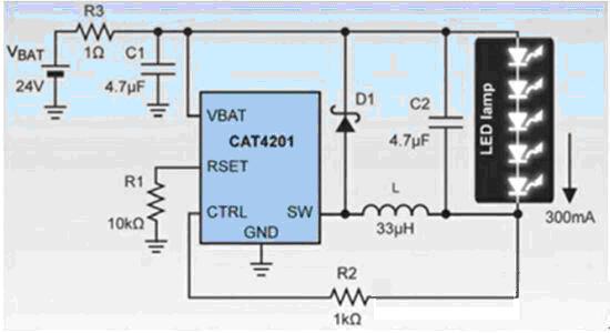 智能樓宇中的備用電源一般為直流24V,市電斷電之后仍需要備用照明長(zhǎng)時(shí)間的工作,省電是備用照明的重點(diǎn),此時(shí)正是電感型轉(zhuǎn)換器LED驅(qū)動(dòng)器的用武之地。圖3說明了如何利用CAT4201從一個(gè)24V電源來驅(qū)動(dòng)5只1W的LED。