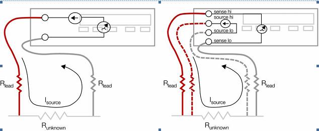 源端引線中的串聯(lián)電阻不影響電流流動(dòng)。測量/傳感引線幾乎沒有電流流動(dòng),因?yàn)閮x表的輸入阻抗很高。這意味著測量引線中沒有I x R電壓下跌。因此,您只需測量由于流經(jīng)的源電流而在未知電阻器中產(chǎn)生的電壓下跌。