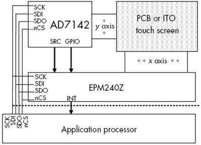 AD7142 CDC可以測量14個傳感器相對于一條SRC走線的電容。增加MAX IIZ CPLD后,可在串行接口的控制下,獲得AD7142 CDC的SRC方波信號,并選擇驅(qū)動觸摸屏的某一條垂直x走線,從而支持多條SRC走線。AD7142 CDC可以進行相對于垂直走線軸或者本地的電容測量。MAX IIZ中大量的I/O (5x5mm封裝支持54個I/O,7x7mm封裝支持116個I/O)結(jié)合AD7142的高分辨率電容數(shù)字測量能力,使這一解決方案能夠適用于面積較大的觸摸屏和面板。