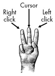 圖1(b)中的傳感器可實現(xiàn)計算導(dǎo)航板,從而避免了使用普通導(dǎo)航板所需要的選擇按鈕。如圖2所示,中指移動光標(biāo),食指和無名指觸摸屏幕,指示鼠標(biāo)左鍵或者右鍵點擊。去掉移動部分后,電容觸摸屏傳感器比按鍵和按鍵開關(guān)更耐用。
