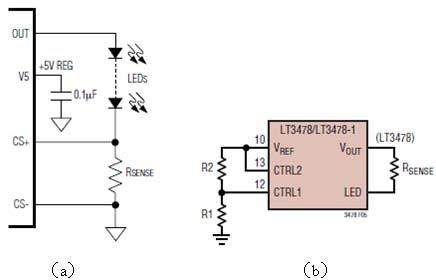 調(diào)節(jié)LED的電流最簡(jiǎn)單的方法就是改變和LED負(fù)載串聯(lián)的電流檢測(cè)電阻(圖2a),幾乎所有DC-DC恒流芯片都有一個(gè)檢測(cè)電流的接口,是檢測(cè)到的電壓和芯片內(nèi)部的參考電壓比較,來控制電流的恒定。但是這個(gè)檢測(cè)電阻的值通常很小,只有零點(diǎn)幾歐,如果要在墻上裝一個(gè)零點(diǎn)幾歐的電位器來調(diào)節(jié)電流是不大可能的,因?yàn)橐€電阻也會(huì)有零點(diǎn)幾歐了。所以有些芯片提供一個(gè)控制電壓接口,改變輸入的控制電壓就可以改變其輸出恒流值。例如凌特公司的LT3478(圖2b)只要改變R1和R2的比值,也可以改變其輸出的恒流值。