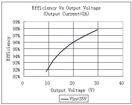 圖中的輸入電壓為35V,輸出電流為2A,當(dāng)輸出電壓為30V時(shí),效率可以高達(dá)97.8%。但是當(dāng)輸出電壓降低到20V時(shí),效率就降為96%;當(dāng)輸出電壓降低為10V時(shí),效率就降低為92%。在這三種情況下,盡管其輸出功率依次為60W,40W和20W,但是其損耗功率卻依次為1.2W,1.6W,1.6W。后兩種情況下功耗增大了33%。假如恒流模塊的散熱系統(tǒng)設(shè)計(jì)得非常臨界,增加33%的耗散功率就有可能會(huì)使芯片的結(jié)溫升高,以致發(fā)生過溫保護(hù)而無法工作,嚴(yán)重時(shí)也有可能使芯片燒毀。