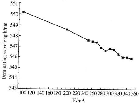 當(dāng)正向電流為350mA時(shí),主波長(zhǎng)為545.8nm;當(dāng)正向電流減小為200mA時(shí),主波長(zhǎng)為548.6nm;當(dāng)正向電流減小為100mA時(shí),主波長(zhǎng)為550.2nm。