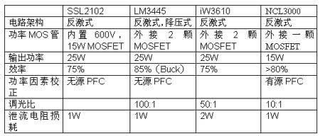 目前市場(chǎng)上主要有恩智浦的SSL2101/2,國(guó)半的LM3445,iWatt的iW3610和OnSemi的NCL3000四種兼容可控硅調(diào)光的驅(qū)動(dòng)IC。其特點(diǎn)如下: