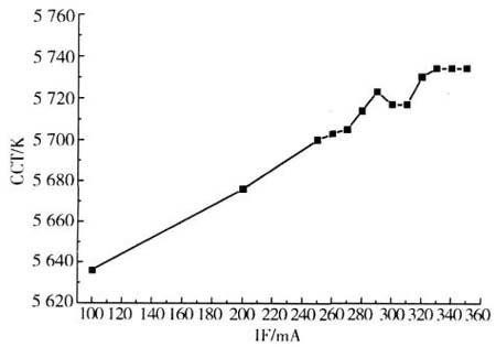 由圖4可知,當(dāng)正向電流為350mA時(shí),色溫為5734K,而正向電流增加到350mA時(shí),色溫就偏移到5636K。電流再進(jìn)一步減小時(shí),色溫會(huì)向暖色變化。