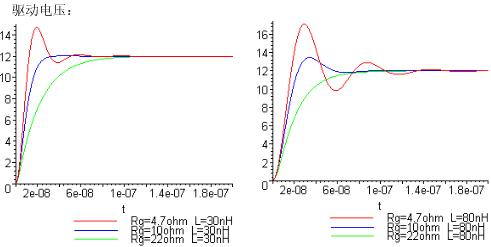 可以看到當(dāng)Rg比較小時驅(qū)動電壓上沖會比較高,震蕩比較多,L越大越明顯,此時會對MOSFET及其他器件性能產(chǎn)生影響。但是阻值過大時驅(qū)動波形上升比較慢,當(dāng)MOSFET有較大電流通過時會有不利影響。