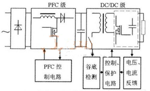 所研究的開關(guān)電源結(jié)構(gòu)如圖1所示,采用兩級PFC結(jié)構(gòu),由PFC預(yù)變換器、隔離變換器和同步整流電路組成的DC/Dc變換器以及檢測與保護(hù)電路組成。交流電壓經(jīng)整流后先輸入到PFC預(yù)變換器進(jìn)行功率因數(shù)校正變換,再由電源控制電路控制隔離變換器,將直流電壓轉(zhuǎn)換成高頻交流脈沖電壓,此脈沖電壓經(jīng)同步整流器整流、濾波電路濾波后,得到所需的直流。