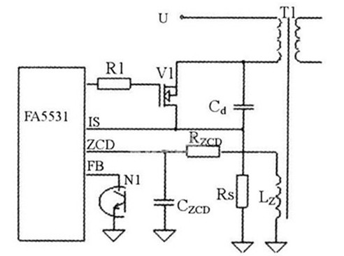 功率隔離變換器電路如圖5所示,由控制電路和反激式變換器組成。圖中,變壓器輔助繞組LZ、電阻RZCD、電容CzcD組成谷底探測電路,為控制芯片F(xiàn)A5531提供谷底檢測信號。光電耦合器N1次級將輸出電壓反饋信號輸入控制芯片。電路啟動后,F(xiàn)A5531輸出驅(qū)動信號使V1導(dǎo)通,V1電流上升,此電流由Rs檢測輸入到控制芯片的IS引腳,與由反饋輸入FB引腳的電壓決定的參考電壓進(jìn)行比較,達(dá)到參考電壓時,V1關(guān)斷,變壓器繞組電壓反相,變壓器初級電感向次級負(fù)載饋送能量。當(dāng)向次級饋送能量過程結(jié)束時,次級電流下降到零。變壓器漏感與開關(guān)管寄生電容Cd構(gòu)成了諧振電路,變壓器輔助繞組感應(yīng)此諧振電路的諧振電壓,并輸入到FA5531P的ZCD引腳。當(dāng)次級電流下降到零時,諧振電路的諧振電壓迅速下降,輔助繞組的感應(yīng)電壓也迅速下降,當(dāng)ZCD引腳上的電壓降至谷底探測閾值時,F(xiàn)A5531P驅(qū)動輸出使V1重新導(dǎo)通。由于電阻RzcD、電容CzcD會引入延時,選擇合適的RzcD、CzcD值,就可實現(xiàn)V1零電壓開通。