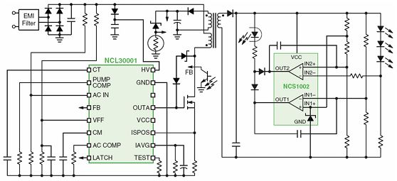 區(qū)域照明應用除了采用分布式/模塊化方案之外,還可采用整體式/單段式方案。例如可以采用安森美半導體的NCL30001功率因數(shù)校正TRIAC可調(diào)光LED驅(qū)動器。