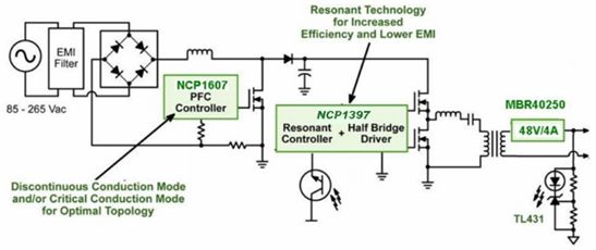 LLC拓撲結(jié)構(gòu)采用串聯(lián)類型的諧振轉(zhuǎn)換器,能在相對寬的輸入電壓和輸出負載范圍下工作。此外,由于諧振儲能元件可以部分或完全集成在主變壓器中,LLC拓撲結(jié)構(gòu)只需要數(shù)量有限的元器件。再加上在所有負載條件下,LLC拓撲結(jié)構(gòu)的初級開關(guān)都能工作在零電壓開關(guān)條件,次級整流器都能工作在零電流開關(guān)條件。所以,LLC拓撲結(jié)構(gòu)是高性價比、高能效及優(yōu)化了電磁干擾的解決方案。