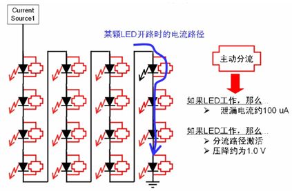 區(qū)域照明應用中通常會采用多串LED,雖然LED本身可靠性高,但若LED串中的某個LED開路,那么整串LED就可能關(guān)閉,而街道照明等應用中必須避免這種狀況,從而降低后期維護成本。為了增強LED串的可靠性,這種安森美半導體推出了NUD4700 LED電流旁路保護器。NUD4700器件是一款分流器件,當LED串中某個LED開路時,就會提供電流旁路,確保整串LED不會關(guān)閉;而且恰當處理散熱的話,還可支持大于1 A的大電流,其工作原理如圖8所示。