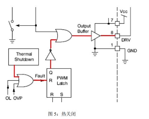 5.欠壓保護(hù)(UVP)/反饋環(huán)路異常保護(hù):UVP可以防止在反饋故障條件下啟動(dòng)。當(dāng)VFB<8%VPREF=0.2V時(shí),UVP激活,器件關(guān)閉;當(dāng)VFB高于12%VPREF=0.3V時(shí),器件自動(dòng)開始工作。