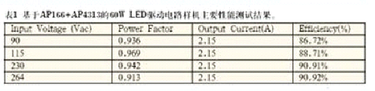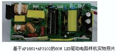 AP1661是一款工作于臨界導(dǎo)通模式下的有源功率因數(shù)校正控制芯片,可廣泛應(yīng)用于開關(guān)電源、LED驅(qū)動(dòng)和電子鎮(zhèn)流器的預(yù)調(diào)整變換器控制。該芯 片內(nèi)部包括1個(gè)啟動(dòng)定時(shí)器可滿足待機(jī)應(yīng)用要求,1個(gè)能實(shí)現(xiàn)接近于1的功率因數(shù)的單象限乘法器和1個(gè)零電流檢測(cè)模塊確保臨界斷續(xù)方式工作。AP1661的圖 騰柱驅(qū)動(dòng)輸出能夠?yàn)橥獠縈OSFET或IGBT提供最大600mA驅(qū)動(dòng)電流和800mA關(guān)斷電流能力。采用了先進(jìn)的雙極型互補(bǔ)金屬氧化物半導(dǎo)體設(shè)計(jì)和制造 工藝,具有低啟動(dòng)電流,低工作電流和低功耗的特點(diǎn)。AP1661同時(shí)具有完善的保護(hù)功能,包括過壓保護(hù)、帶有滯后的輸入欠壓鎖定和乘法器輸出嵌位以限制開 關(guān)最大峰值電流。圖7為該方案60W應(yīng)用電路樣機(jī)實(shí)物照片。圖8為應(yīng)用該方案LED直管燈實(shí)物照片。