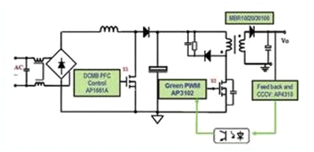 在更大功率應(yīng)用條件下,單級(jí)PFC電路難以同時(shí)兼顧PFC預(yù)調(diào)整和反激電路輸出恒流調(diào)整性能,這時(shí)需要采用兩級(jí)電路架構(gòu)實(shí)現(xiàn)這一目標(biāo)。因此,有新推出的PFC+PWM 兩級(jí)架構(gòu)電路拓?fù)浞桨?,該方案電路原理圖如圖9所示。