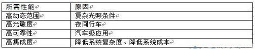考慮到夜間行車,有些道路沒有路燈或者路燈很暗,汽車視覺系統(tǒng)也需要在低光照場景下采集路況信息。針對汽車應(yīng)用,圖像傳感器需要滿足一系列汽車級(jí)要求,如寬溫度范圍、高可靠性、高集成度、低成本等。表1總結(jié)了汽車視覺系統(tǒng)中圖像傳感器應(yīng)該具有的性能:
