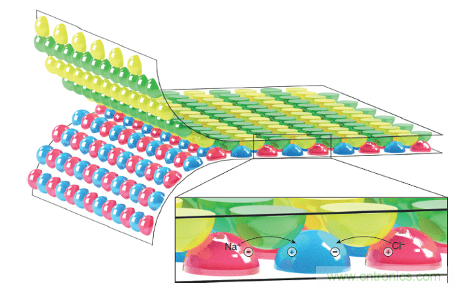 紅色凝膠含有鹽水,而藍色凝膠含有淡水。離子原本會從紅色凝膠流向藍色凝膠,但由于基板的間隔,無法出現(xiàn)這樣的流動。與此同時,與這塊基板對應(yīng)的另一塊基板上布置了綠色和黃色凝膠,當(dāng)它們橋接在藍色和紅色凝膠之間的空隙時,就能為離子運動提供通道。