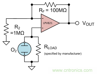 用氧氣傳感(見圖 3) 作為具體的應(yīng)用實(shí)例,假設(shè)感應(yīng)器的最大輸出電壓為10mV(通過制造商指定的負(fù)載電阻將電流轉(zhuǎn)換成電壓R_L) ,則運(yùn)算放大器的滿量程輸出電壓為1V。通過Equation 2,可以看出 A_CL 的值需要為100,或者R_F是R_2的100倍。分別選擇100MΩ電阻和1MΩ電阻,得出增益值為101,且電阻值足夠大到可以限制電流并最小化功耗。