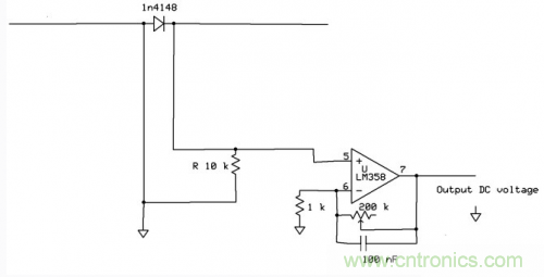 DC的輸出電壓還可以用LM358上的另一個(gè)運(yùn)放在進(jìn)行一次放大。圖中的100nF電容起到對整流后的電信號進(jìn)一步濾波的作用。