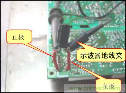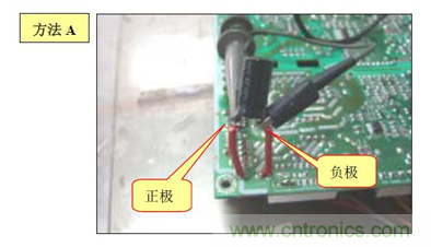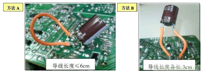 B. 方法(2):在電源板的錫面找出待測(cè)電容正負(fù)極對(duì)應(yīng)的焊點(diǎn),焊上兩根導(dǎo)線,然后用電壓探頭夾住引出的導(dǎo)線測(cè)試.如下圖: