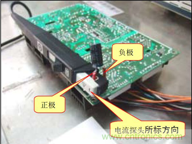 A.將電流探頭夾持待測(cè)電解電容正極PIN 腳,并且注意探頭所標(biāo)方向與電容電流方向一致. 如下圖: