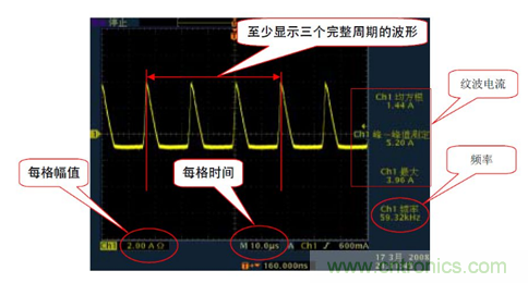 C.電容紋波電流測(cè)試.測(cè)試時(shí)將<<每格幅值>>檔調(diào)到適當(dāng)?shù)母穸? 將<<每格時(shí)間>>檔調(diào)到適當(dāng)?shù)母穸?示波器屏幕上至少顯示三個(gè)完整周期的波形);調(diào)節(jié)<>旋鈕使波形穩(wěn)定,再按<>鍵采集波形,如下圖: