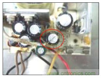 A.當(dāng)電路板上電容所在的位置周圍沒有裝有發(fā)熱器件時(shí),直接將溫度感應(yīng)探測(cè)端接于電容頂部鋁殼上, 溫度感應(yīng)探測(cè)線另一端連接點(diǎn)溫機(jī),如下圖: