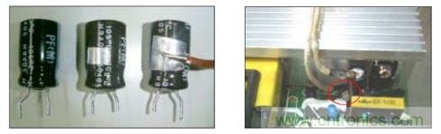 B.當(dāng)電路板上電容所在的位置周圍有發(fā)熱器件(如功率管,散熱片等)時(shí), 將溫度感應(yīng)探測(cè)端接于電容靠近發(fā)熱源的側(cè)面鋁殼上,將對(duì)著發(fā)熱源的鋁殼表面膠管剝掉一小塊,用點(diǎn)溫膠直接粘連(或利用熱傳導(dǎo)率高的銀膠帶連接,用酒精等東西擦式表面后貼上銀色膠帶),溫度感應(yīng)探測(cè)線另一端連接點(diǎn)溫機(jī),如下圖: