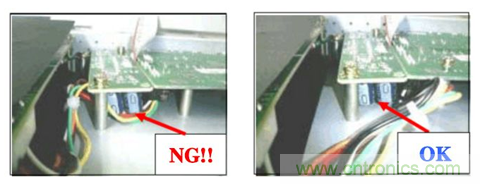 2 請(qǐng)確保電解電容防爆閥和chassis 之間要有2mm 以上的距離。此外組裝時(shí)防爆閥和chassis之間的間隙不要放入harness 才可以。如下圖: