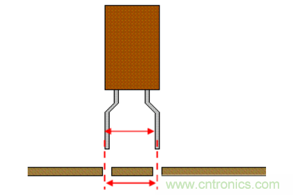 電解電容需要整形時(shí),請(qǐng)使用電容引腳間距和基板焊盤間距一致的電容.如下圖: