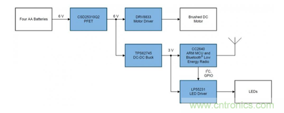 電機驅(qū)動器:驅(qū)動電流、電源電壓范圍、負載電機類型和安全關(guān)閉功能都是選擇電機驅(qū)動器時的因素。DRV8833可以驅(qū)動多種類型的電機和感性負載,峰值電流為2A,電源電壓范圍為2.7V至10.8V,非常適合使用四節(jié)AA電池。標稱驅(qū)動電壓電池的電壓是5V。
