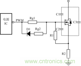 關(guān)斷瞬間驅(qū)動(dòng)電路能提供一個(gè)盡可能低阻抗的通路供MOSFET柵源極間電容電壓快速泄放,保證開(kāi)關(guān)管能快速關(guān)斷。為使柵源極間電容電壓的快速泄放,常在驅(qū)動(dòng)電阻上并聯(lián)一個(gè)電阻和一個(gè)二極管,如圖3所示,其中D1常用的是快恢復(fù)二極管。這使關(guān)斷時(shí)間減小,同時(shí)減小關(guān)斷時(shí)的損耗。Rg2是防止關(guān)斷的時(shí)電流過(guò)大,把電源IC給燒掉。