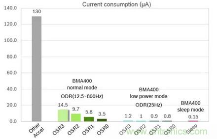 BMA400在低功耗模式(low power mode)消耗的電流會(huì)更低,最低可以達(dá)到0.8uA (800nA,OSR=0) 。
