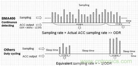 可是,如我們前述“加速度傳感器在物聯(lián)網(wǎng)應(yīng)用中扮演重要角色”,傳感性能決定了系統(tǒng)能否基于傳感器做出精準(zhǔn)的識(shí)別和決策。為了提高對(duì)原始信號(hào)的有效采集,并降低噪聲及高頻信號(hào)的干擾(混疊Aliasing),BMA400在正常工作模式下,采用了連續(xù)采樣和滑動(dòng)低通濾波的方式。
