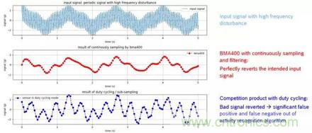 下圖顯示了連續(xù)采樣(continuous sampling)和周期休眠(duty cycling)兩種不同的采樣模式對(duì)于高頻噪聲的抗干擾能力的顯著區(qū)別。