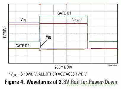 圖 4 示出了失去 3.3V 電壓軌時的波形。當輸入電壓下降時,Q2 的柵極電壓保持不變 (接近于地電位),而且 Q2 處于關斷狀態(tài)。與此相反,Q1 的柵極電壓則急劇上升至 3.3V。這把 Q1 關斷,由 Q1 的體二極管起隔離二極管的作用,從而使負載與輸入分離。此時備份電源接管供電,LTC3643 通過釋放存儲電容器的電能以給關鍵的負載提供3.3V。
