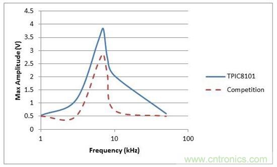 圖 2 顯示了表 1 中的結(jié)果。 噪聲等級(jí) () 在兩個(gè)器件之間大概是相同的,因?yàn)檫h(yuǎn)離中心頻率的振幅基本相同。 在中心頻率,TPIC8101 具有更高的振幅,這意味著其 SNR 要優(yōu)于競爭產(chǎn)品。