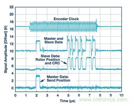圖6顯示了EnDat系統(tǒng)的測試結(jié)果。測試使用的時鐘頻率為8 MHz,延遲補(bǔ)償通過接收時鐘相移實(shí)現(xiàn)。底部信號是來自EnDat主機(jī)的命令。此處顯示的命令為“發(fā)送位置”,其前面是兩個0,接著是六個1,最后又是兩個0。該命令總共有10位。編碼器的響應(yīng)是從頂部起的第三個信號。合并數(shù)據(jù)線是從頂部起的第二個信號。最后,頂部信號是施加于編碼器的時鐘。