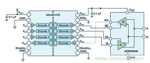 RS-485信號傳輸是平衡的差分式傳輸,本身便能抗干擾。系統(tǒng)噪聲均等地耦合到RS-485雙絞線電纜中的每條導(dǎo)線。一個信號的發(fā)射與另一個信號相反,耦合到RS-485總線的電磁場彼此抵消。這降低了系統(tǒng)的電磁干擾(EMI)。此外,ADM3065E增強(qiáng)的2.1 V驅(qū)動強(qiáng)度支持在通信中實(shí)現(xiàn)更高的信噪比(SNR)。給ADM3065E增加信號隔離可利用ADuM141D輕松實(shí)現(xiàn)。ADuM141D是一款采用ADI公司iCoupler®技術(shù)的四通道數(shù)字隔離器。ADuM141D的工作數(shù)據(jù)速率最高可達(dá)150 Mbps,因此它適合與50 Mbps ADM3065E RS-485收發(fā)器一起工作(參見圖2)。直接功率注入(DPI)法測量器件抑制注入到電源或輸入引腳的噪聲的能力。ADuM141D采用的隔離技術(shù)已通過測試,符合DPI IEC 62132-4標(biāo)準(zhǔn)。ADuM141D抗擾度性能超過同類產(chǎn)品。ADuM141D在整個頻率范圍內(nèi)保持了出色的性能,而其他隔離產(chǎn)品在200 MHz至700 MHz頻段出現(xiàn)位錯誤。