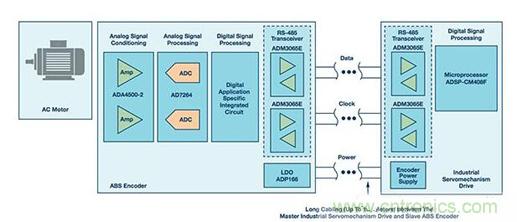 【導(dǎo)讀】旋轉(zhuǎn)編碼器廣泛用于工業(yè)自動化系統(tǒng)中。此類編碼器的典型應(yīng)用是電力機(jī)械,其中編碼器連接到旋轉(zhuǎn)軸,從而向控制系統(tǒng)提供反饋。雖然編碼器的主要用途是角度位置和速度測量,但系統(tǒng)診斷和參數(shù)配置等其他特性也很常見。圖1顯示了一個電機(jī)控制信號鏈,其利用RS-485收發(fā)器和微處理器連接絕對編碼器(ABS編碼器)從機(jī)和工業(yè)伺服驅(qū)動器主機(jī),以實(shí)現(xiàn)對交流電機(jī)的閉環(huán)控制。