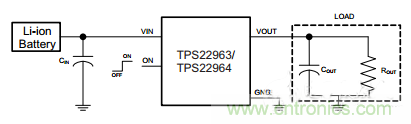 TI負載開關(guān)是用來接通和關(guān)閉電源軌的集成電子中繼器。大多數(shù)基本負載開關(guān)采用小型集成封裝,由四個引腳組成:輸入電壓、輸出電壓、使能、和接地,并且包含多重特性,其中有反向電流保護。圖4顯示了一個用來阻斷反向電流的負載開關(guān)。