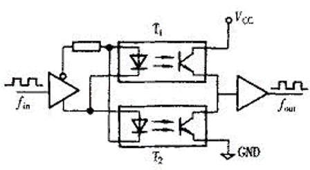 用2只光電耦合器T1,T2接成互補推挽式電路,可以提高光耦的開關速度,如圖5所示。當脈沖上升為“1”電平時,T1截止,T2導通。相反,當脈沖為“0”電平時,T1導通,T2截止。這種互補推挽式電路的頻率特性大大優(yōu)于單個光電耦合器的頻率特性。