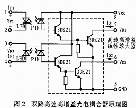 近幾年來,國內(nèi)有關(guān)單位投入大量人力物力也研究和開發(fā)了各種光電耦合器件。如上海半導(dǎo)體器件八廠、上海無線電十七廠等。而重慶光電技術(shù)研究所為了適應(yīng)市場需要研制出了一種由高速響應(yīng)發(fā)光器件和邏輯輸出型光接收放大器組成的厚膜集成雙路高速高增益電耦合器。這種光電耦合器的輸入端由兩只GaAIAs側(cè)面發(fā)光管組成,其輸出端由兩只Si—PIN光電探測器以及兩個(gè)高速高增益線性放大電路組成。圖2所示為其原理電路圖,除此之外,重慶光電技術(shù)研究所還研制出了高速高壓光電耦合器、GG2150I型射頻信號光電耦合器、GG2060I型高壓脈沖測量光電耦合器、GH1204U型高壓光傳輸光電耦合器以及 GH1201Y型和GOHQ-I型光電耦合器等。