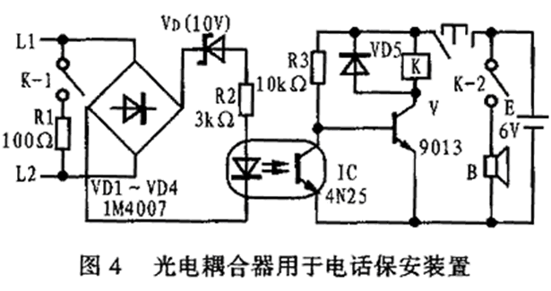 為了防止電話線路被并機(jī)竊用或電話機(jī)被盜用通話,可以利用光電耦合器來設(shè)計(jì)一個(gè)簡單實(shí)用的電話保安電路,其實(shí)隔電路如圖4所示。圖中,由VD1~VD4組成極性轉(zhuǎn)換電路。由于在將本保安器接入電話線路中時(shí),不需要分清電話線路反饋電壓的極性,因此,使用該保安器可以給安裝帶來很大的方便。